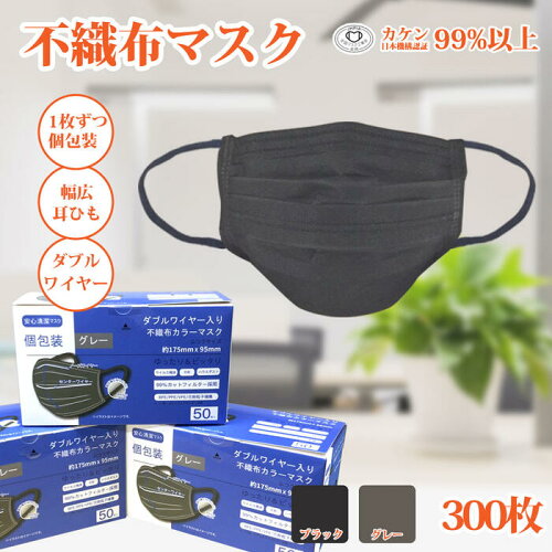 マスク 不織布 カラー 300枚 ダブルワイヤー 立体 1枚づつ 個包装 大きめ 夏用 苦しくない 黒 ブラック 3層構造 男女兼用 グレー おしゃれ uvカット メンズ オシャレ 使い捨て 耳が痛くならない やわらか 平ゴム ふんわり やさしい 全国マスク工業会