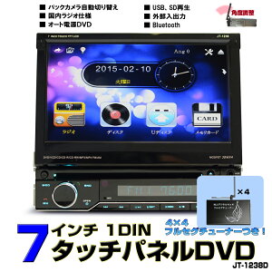 ■ 液晶モニター角度を自動記憶・自動調整 ■ USB、microSD、DVD内蔵 ■ 美しいイルミネーションパネル 7色自由調整 ■ 型名:JT-1238D 液晶サイズ    7インチワイドタッチパネル 対応メディア    DVD/CD/CD-R/CD-RW/VCD/SVCD/DVCD  DVD-R/DVD+RW/MP3/AVI/JPG/DIVX/XVID 解像度    800x480 約115万画素数 アンプ    30W×4 本体色    ブラック 映像入力     2系統 映像出力     2系統 FMチューニングレンジ    AM522-1629kHz/FM76.0-90.0MHz 国内仕様 電源     DC12V 付属品     取付け金具、   電源配線、リモコン   映像音声入出力配線   DVD英語取扱説明書   4x4フルセグチューナーセット★