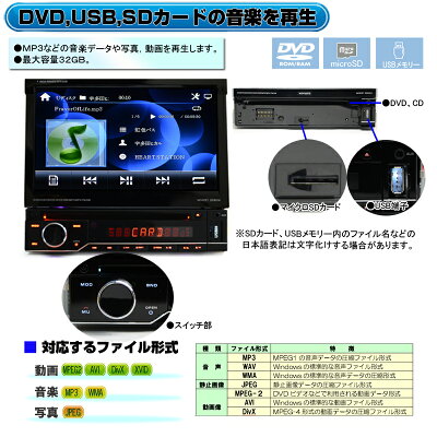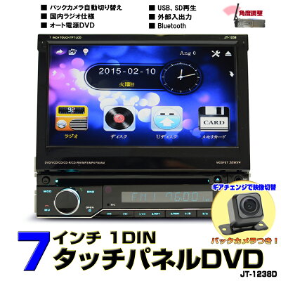 ■ 液晶モニター角度を自動記憶・自動調整 ■ USB、microSD、DVD内蔵 ■ 美しいイルミネーションパネル 7色自由調整 ■ 型名:JT-1238D 液晶サイズ    7インチワイドタッチパネル 対応メディア    DVD/CD/CD-R/CD-RW/VCD/SVCD/DVCD  DVD-R/DVD+RW/MP3/AVI/JPG/DIVX/XVID 解像度    800x480 約115万画素数 アンプ    30W×4 本体色    ブラック 映像入力     2系統 映像出力     2系統 FMチューニングレンジ    AM522-1629kHz/FM76.0-90.0MHz 国内仕様 電源     DC12V 付属品     取付け金具、   電源配線、リモコン   映像音声入出力配線   DVD英語取扱説明書   バックカメラセット 同梱バックカメラ仕様について、入荷,在庫の関係で仕様変更されることがあります。