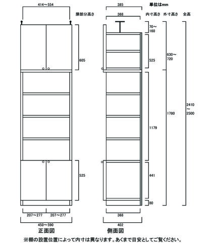 【オプション加工】1.5cm棚板ピッチ、幅木よけ、(配線用)裏板穴加工、タフ棚板穴加工 等 ※幅違い・高さ違い・奥行違いは全サイズ別一覧よりお選び下さい 厚型下扉付きキッチン収納 タフ棚板(厚さ2.5cm) 奥行40cm×高さ241〜250cm×幅45〜59cm サイズオーダー 食器棚・キッチンボード 幅は1cm単位で指定 厚型下扉付きキッチン収納 本体高さ178cm 突張棚高さ56cm 本体扉高さ52.5cm(下扉) 突張棚扉高さ60.5cm ご注意 オプション加工を選択されても価格が自動計算されません。