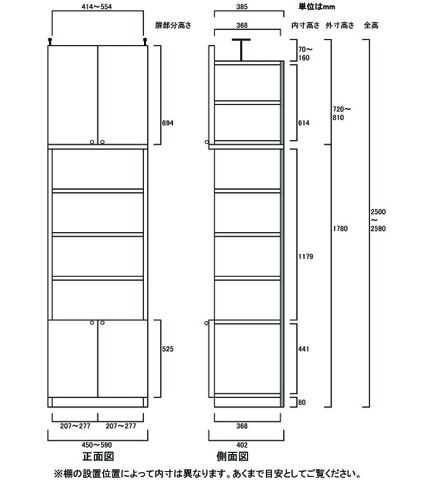 商品仕様 ■タイプ: タフ棚板(棚板厚さ2.5cm)タイプ ■棚板耐荷重: 10Kg ■外寸: 奥行40cm×高さ250〜259cm×幅45〜59cm (幅は1cm単位でオーダーできます) ■対応天井高:(2m50cm〜2m59cm) 250cm 251cm 252cm 253cm 254cm 255cm 256cm 257cm 258cm 259cm 伸縮式のつっぱり金具で高さ2m50cm〜2m59cmの天井に対応します (2m50cm 2m51cm 2m52cm 2m53cm 2m54cm 2m55cm 2m56cm 2m57cm 2m58cm 2m59cm) ■外寸(幅): 45cm 46cm 47cm 48cm 49cm 50cm 51cm 52cm 53cm 54cm 55cm 56cm 57cm 58cm 59cm ■棚板枚数 移動固定棚板:7 ■構成:本体…奥行40cm×高さ178cm×幅45〜59cm 突っ張り棚…奥行40cm×高さ65cm×幅45〜59cm 本体用扉…高さ52.5cm×幅45〜59cm 突っ張り棚用扉…高さ69.4cm×幅45〜59cm オーダー 厚型下扉付きキッチン収納_ 商品詳細 本体 + 突っ張り棚 + 本体用扉 + 突っ張り棚用扉のセットです。