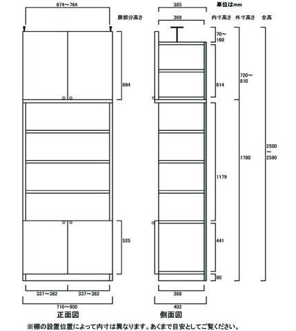 商品仕様 ■タイプ: タフ棚板(棚板厚さ2.5cm)タイプ ■棚板耐荷重: 10Kg ■外寸: 奥行40cm×高さ250〜259cm×幅71〜80cm (幅は1cm単位でオーダーできます) ■対応天井高:(2m50cm〜2m59cm) 250cm 251cm 252cm 253cm 254cm 255cm 256cm 257cm 258cm 259cm 伸縮式のつっぱり金具で高さ2m50cm〜2m59cmの天井に対応します (2m50cm 2m51cm 2m52cm 2m53cm 2m54cm 2m55cm 2m56cm 2m57cm 2m58cm 2m59cm) ■外寸(幅): 71cm 72cm 73cm 74cm 75cm 76cm 77cm 78cm 79cm 80cm ■棚板枚数 移動固定棚板:7 ■構成:本体…奥行40cm×高さ178cm×幅71〜80cm 突っ張り棚…奥行40cm×高さ65cm×幅71〜80cm 本体用扉…高さ52.5cm×幅71〜80cm 突っ張り棚用扉…高さ69.4cm×幅71〜80cm オーダー 全面下扉付きキッチン収納_ 商品詳細 本体 + 突っ張り棚 + 本体用扉 + 突っ張り棚用扉のセットです。