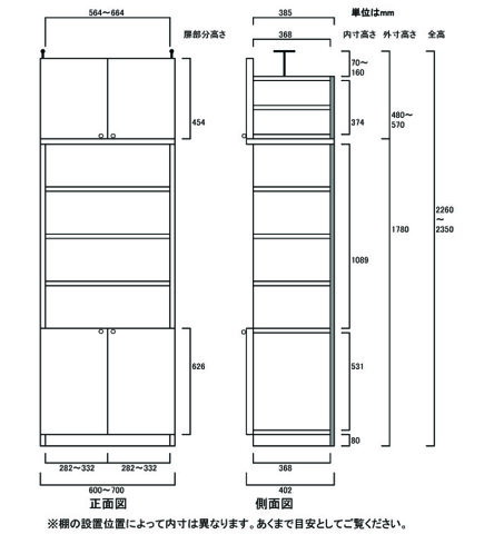【オプション加工】1.5cm棚板ピッチ、幅木よけ、(配線用)裏板穴加工、タフ棚板穴加工 等 ※幅違い・高さ違い・奥行違いは全サイズ別一覧よりお選び下さい 扉付キッチン収納 標準棚板(厚さ1.7cm) 奥行40cm×高さ226〜235cm×幅60〜70cm サイズオーダー 収納家具 幅は1cm単位で指定 扉付キッチン収納 本体高さ178cm 突張棚高さ41cm 本体扉高さ62.6cm(下扉) 突張棚扉高さ45.4cm ご注意 オプション加工を選択されても価格が自動計算されません。