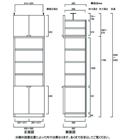【オプション加工】1.5cm棚板ピッチ、幅木よけ、(配線用)裏板穴加工、タフ棚板穴加工 等 ※幅違い・高さ違い・奥行違いは全サイズ別一覧よりお選び下さい 扉付キッチン壁収納 標準棚板(厚さ1.7cm) 奥行40cm×高さ226〜235cm×幅45〜59cm サイズオーダー 食器棚・キッチンボード 幅は1cm単位で指定 扉付キッチン壁収納 本体高さ178cm 突張棚高さ41cm 本体扉高さ62.6cm(下扉) 突張棚扉高さ45.4cm ご注意 オプション加工を選択されても価格が自動計算されません。