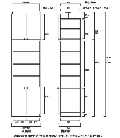 耐震扉付きキッチン壁収納 移動棚 商品仕様 ■タイプ: 標準棚板(棚板厚さ1.7cm)タイプ ■棚板耐荷重: 4Kg ■外寸: 奥行40cm×高さ241〜250cm×幅45〜59cm (幅は1cm単位でオーダーできます) ■対応天井高:(2m41cm〜2m50cm) 241cm 242cm 243cm 244cm 245cm 246cm 247cm 248cm 249cm 250cm 伸縮式のつっぱり金具で高さ2m41cm〜2m50cmの天井に対応します (2m41cm 2m42cm 2m43cm 2m44cm 2m45cm 2m46cm 2m47cm 2m48cm 2m49cm 2m50cm) ■外寸(幅): 45cm 46cm 47cm 48cm 49cm 50cm 51cm 52cm 53cm 54cm 55cm 56cm 57cm 58cm 59cm ■棚板枚数 移動棚板:4 移動固定棚板:3 ■構成:本体…奥行40cm×高さ178cm×幅45〜59cm 突っ張り棚…奥行40cm×高さ56cm×幅45〜59cm 本体用扉…高さ62.6cm×幅45〜59cm 突っ張り棚用扉…高さ60.5cm×幅45〜59cm オーダー 扉付きキッチン壁収納_ 商品詳細 本体 + 突っ張り棚 + 本体用扉 + 突っ張り棚用扉のセットです。