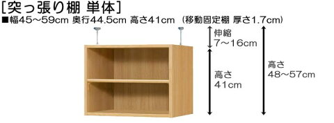 スペースにピッタリサイズでオーダー可能 オーダ突っ張り棚 奥行44.5cm×高さ48〜57cm×幅45〜59cm 幅は1cm単位で指定 標準棚板(厚さ1.7cm) 奥行44.5cm 高さ48〜57cm 幅45〜59cm お客様組立て 低ホルムアルデヒド