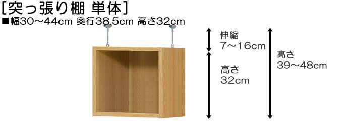 スペースにピッタリサイズでオーダー可能 オーダ突っ張り棚 厚棚板(厚さ2.5cm) 奥行38.5cm×高さ39〜48cm×幅30〜44cm 幅は1cm単位で指定 厚棚板(厚さ2.5cm) 奥行38.5cm 高さ39〜48cm 幅30〜44cm お客様組立て 低ホルムアルデヒド