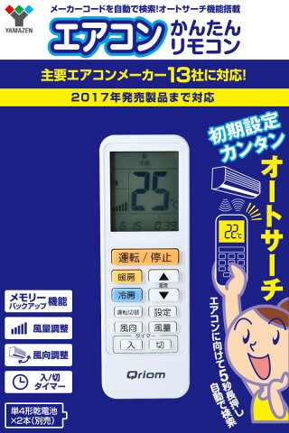 山善(YAMAZEN) エアコンかんたんリモコンメーカー13社 2017年発売製品まで対応 QRA-AS100 本体サイズ 幅5.5×奥行16.5×高さ1.5cm 重量90g 仕様 ●原産国:中国 商品説明 ●動作距離:約7m (部屋の条件により異なります)●電源:DC3V 単4形乾電池2本(別売)●電池持続時間:約12ヶ月(アルカリ乾電池)※使用頻度により異なります●オートサーチ機能(運転ボタンの長押しでエアコンコードを検索します)●メモリーバックアップ機能(電池を交換しても、一度設定したメーカーコードが消えません)●温度が見やすい大型液晶(バックライト付)●無くした、壊れた、そんなときに!●主要メーカー13社対応:東芝、パナソニック/ナショナル、ハイアール、シャープ、ダイキン、富士通ゼネラル、LG電子、日立、サンヨー、コロナ、三菱電機、三菱電工、アイリスオーヤマ※本製品は2017年までに発売された機器のリモコン信号をもとに開発しております。