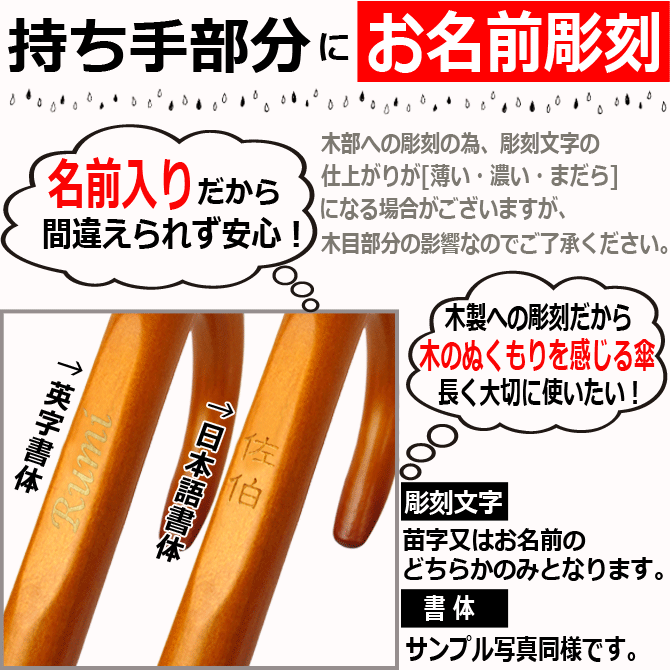 通常は無地の傘なのに、雨に濡れるとお洒落な桜柄が浮かび上がる面白い傘です!カラーはえんじ、紫、ピンクの3色からお選び下さい!柄の部分にお名前を彫刻するので、プレゼントにも最適です!※木部へ直接彫刻しますので、サンプル写真の様にしっかり焼き色が付く場合と そうで無い場合もありますので、ご了承下さい。