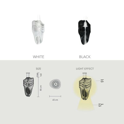 商品名 AVIA SUSPENSION S : BLACK / WHITE ブランドメーカー SLAMP デザイナー Zaha Hadid 品番/型番 MD-SL1011BK/WH 使用電球 ・E26/60W形LED電球×2灯 ・E26/75W形LEDビーム球×1灯 サイズ ・本体:D450×W450×H850(mm) ・コード:max1400mm 重量 5.5kg 素材 Policabonato/Lentiflex 取付方法 ネジ取付型(取付には電気工事が必要です。